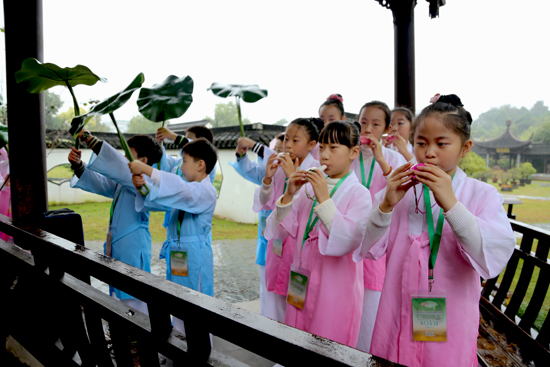 开幕式后的曲水流觞环节,由扬州市文联组织的10个联诗队,包括来自扬州街道、社区的代表队(汶河街道、文昌花园社区),学校、企业的代表队(汶河小学、树人学校、华电扬电公司文联、扬州大学)及本土作家、诗人组成的广陵作协队、谷林诗社、虹桥书院等站在沿岸不同的临水平台,与船上的嘉宾诗人互动觞咏联诗。